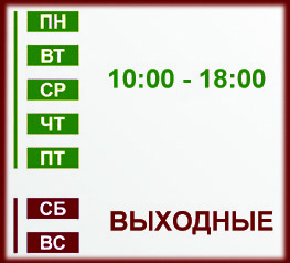 Время работы: понедельник - пятница: 10:00 - 18:00. Выходные: суббота, воскресенье.